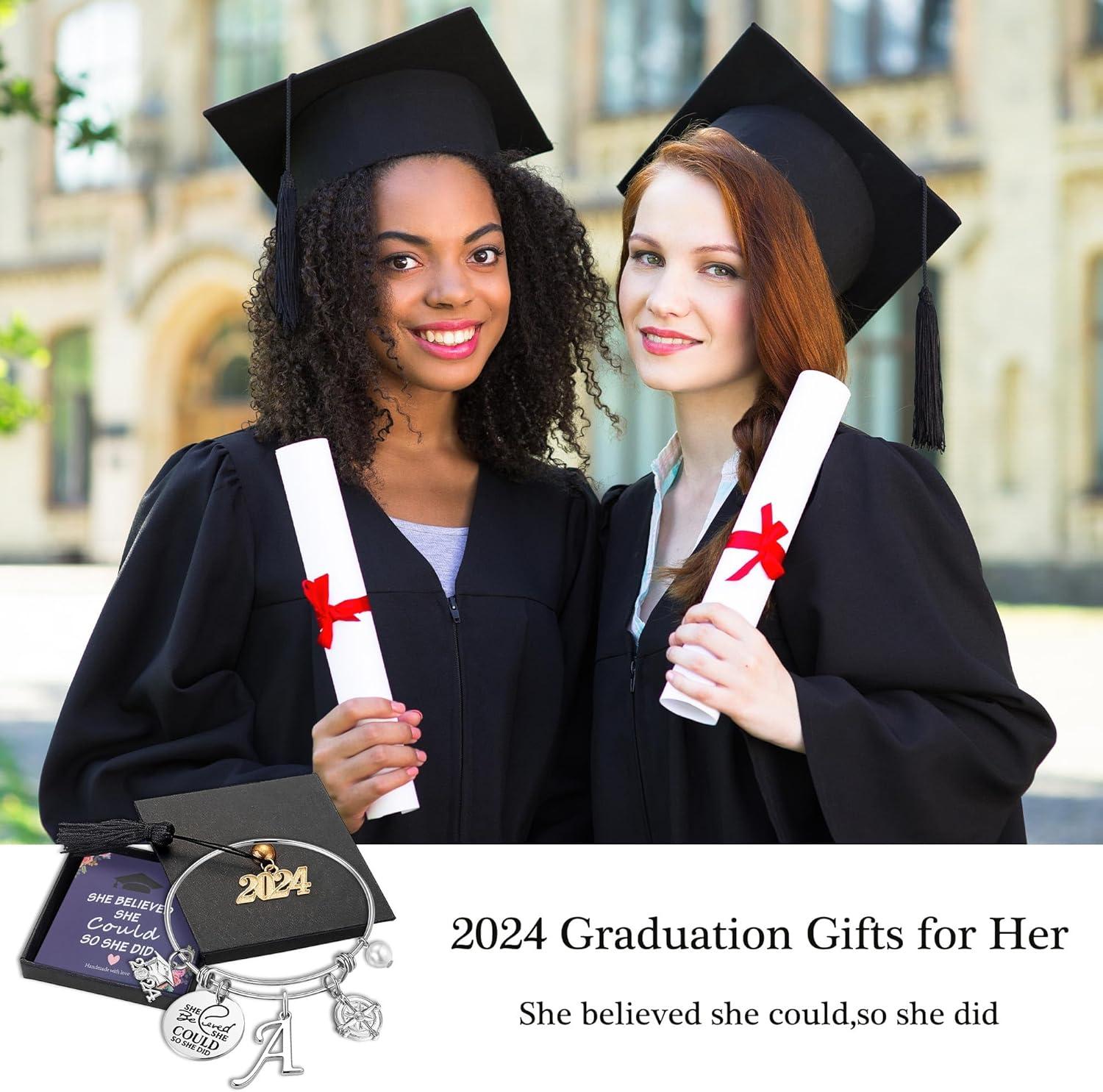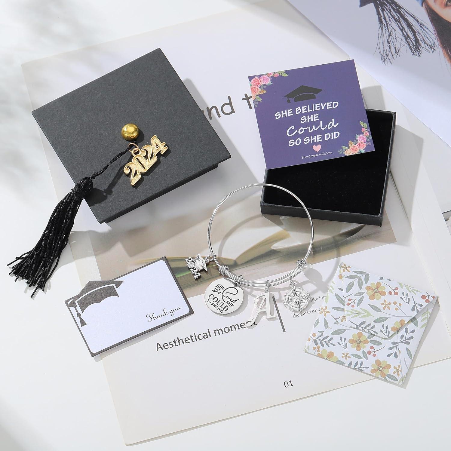 Hidepoo Inspirational Graduation Gifts for Women Bracelet, Engraved Inspirational Compass Graduation Bangle She Believed She Could So She Did Letter K Charm Bracelet Graduation Gifts for Her 2024